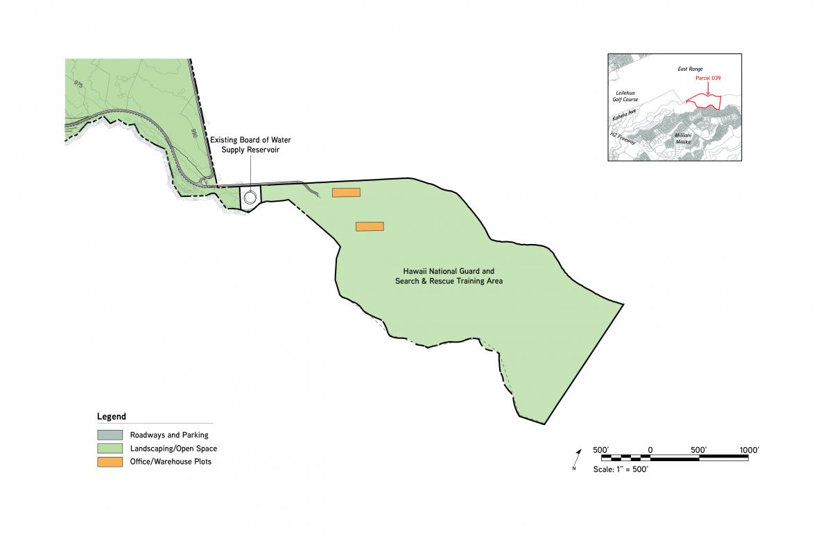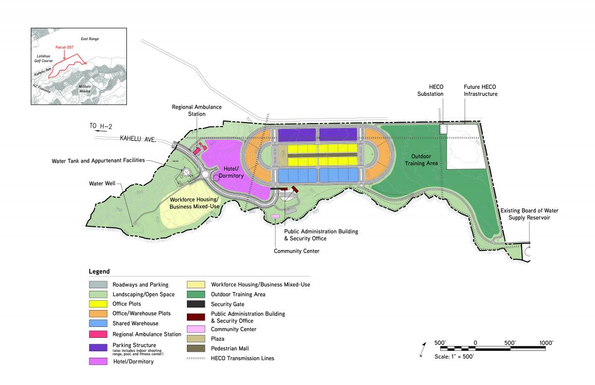 In 2014, the Hawai‘i State Legislature appropriated funds for the acquisition of Phase II of the MTP (Parcels 057 and 039) to create the FRTC. In 2017, Pryzm Consulting LLC prepared a Due Diligence Report prior to HTDC’s acquisition of Parcel 057 from Castle and Cooke. The report included an assessment of a conceptual master plan prepared by the University of Hawai‘i at Mānoa (UH) Community Design Center, which included ten (10) State and County agencies to be located at the campus. The Due Diligence Report found that roads, water, sewer, and electrical infrastructure would need to be developed as none were currently provided to the site and development would require significant improvements to be made. Other potential concerns for development included the required land use entitlements and the potential for any historic properties or cultural resources on site.